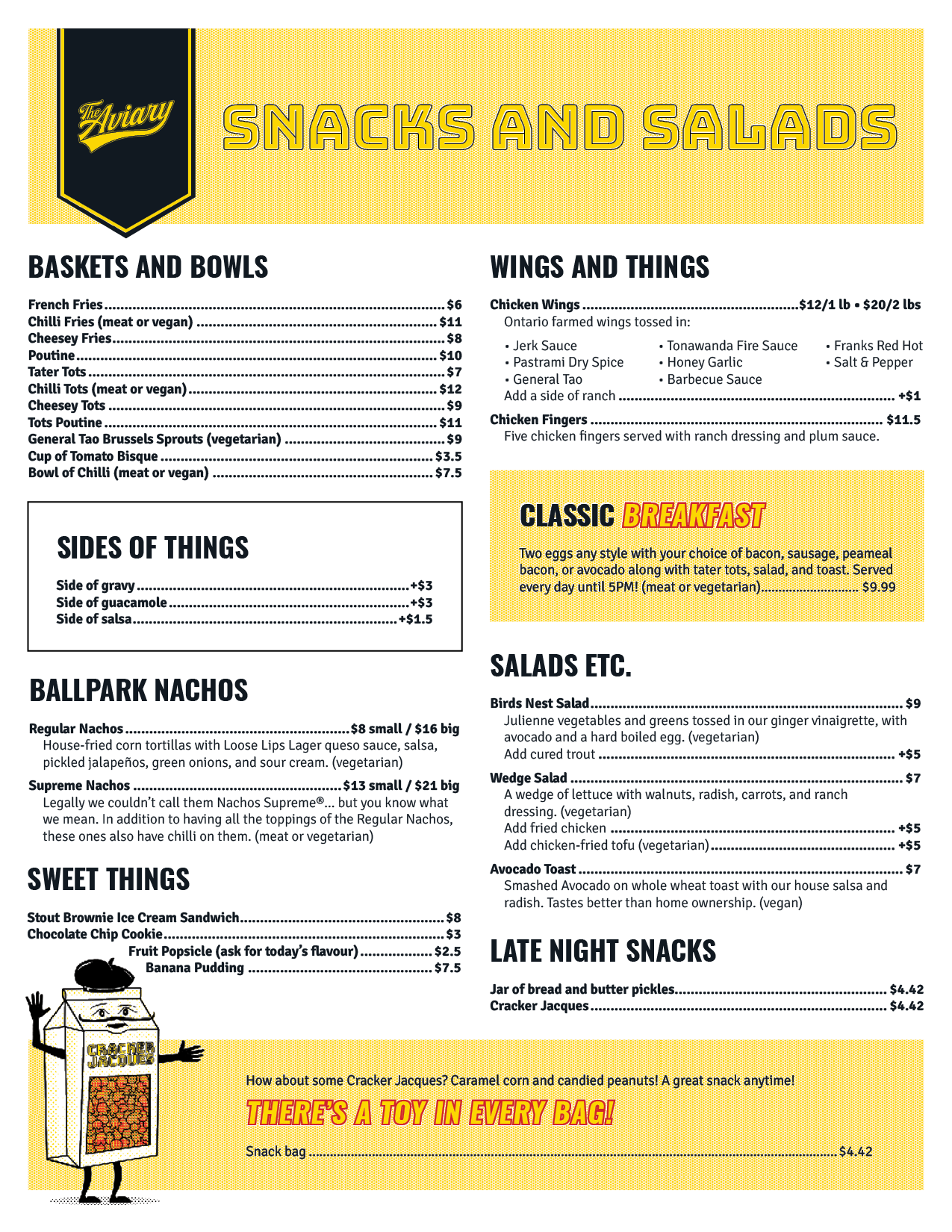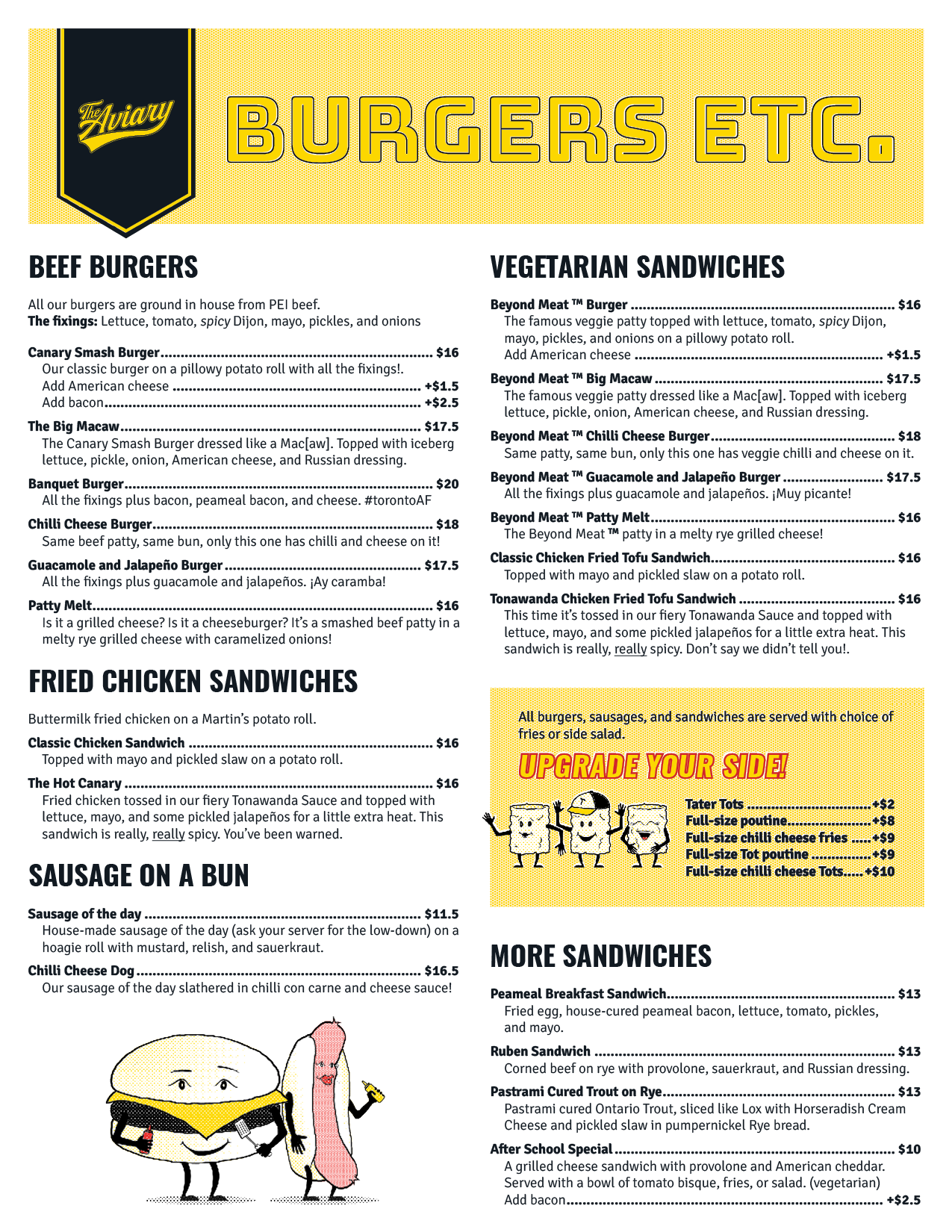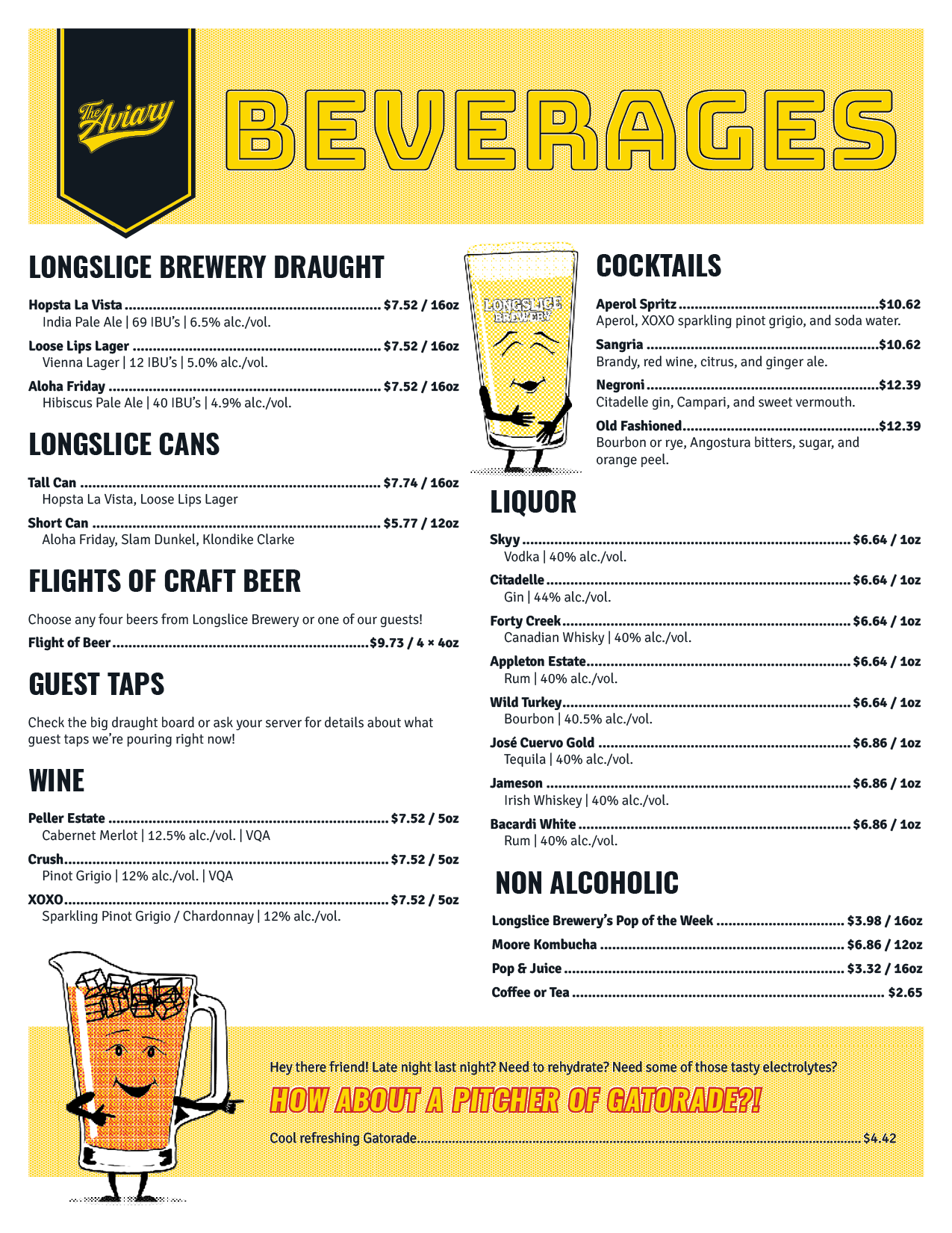 The Aviary opened with classic North American pub and deli food as well as amazing craft beer brewed by Longslice Brewery on-site. We wanted the menu to have a classic diner menu feel as well as being concise and logical in its flow of information.