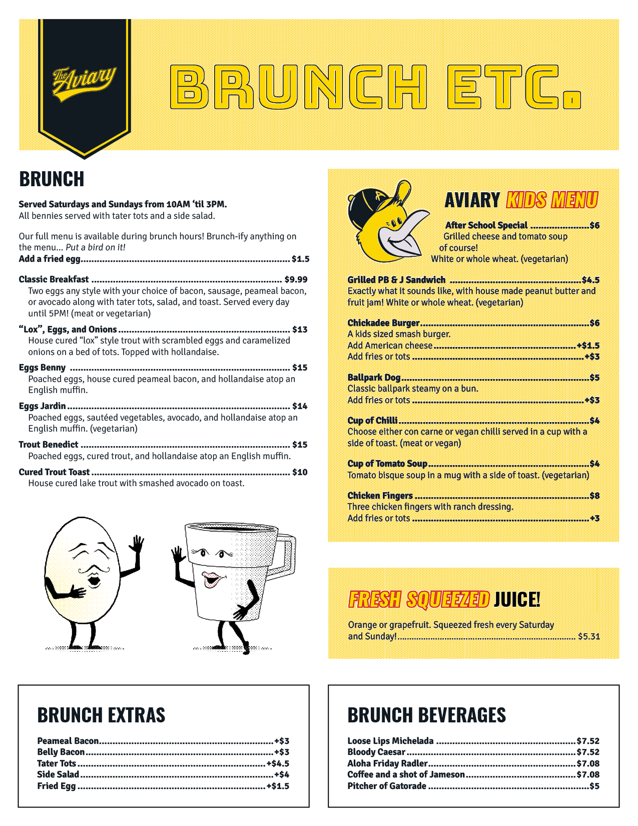 As a community hangout, The Aviary also saw a substantial amount of families coming through for lunch and dinner and we thought it important to create a menu to help keep the kids entertained.
